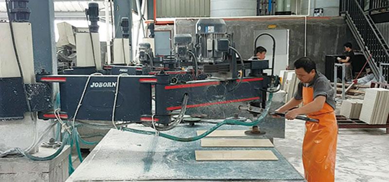 A cabeça da serra tipo pórtico de duas colunas para pedra é fixa na caixa deslizante, e a caixa ira reciprocar na viga. Durante o corte de pedra, o carrinho é fixo e a máquina é estável, o que faz com que seja bastante utilizada por fábricas de placas de pedra.